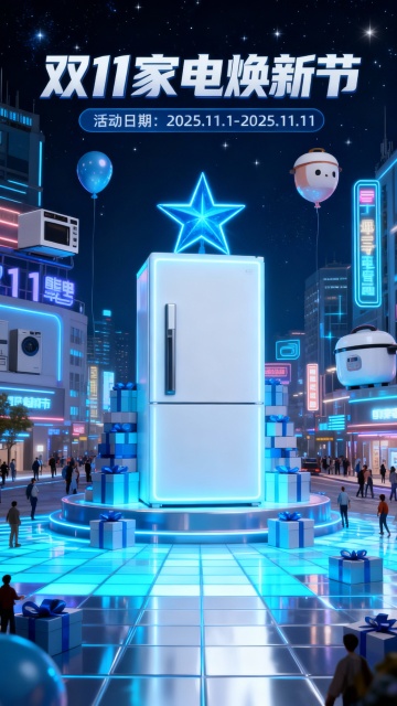 赛博朋克风3D场景,霓虹灯辉映未来都市,家电悬浮于梦幻光影中,金属质感与体积感交织,营造酷炫科技感促销氛围。
