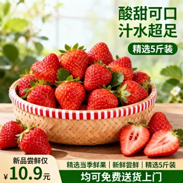 鲜橙水果促销海报,两颗饱满完整的鲜橙和一片带果肉纹理的橙子切片置于木质台面上,鲜橙表皮呈现明亮的橙黄色并带有自然光泽和细微毛孔,果肉色泽饱满橙红,顶部带有翠绿的橙叶,背景为清新的蓝天白云和虚化的绿色果园景致,右上角点缀几片嫩黄色的叶子,整体色调以橙子的橙黄、橙红为主色,搭配绿色边框和文字,上方绿色加粗艺术字体书写“鲜甜多汁 品质优选”,底部左侧绿色圆角矩形内白色文字“送货上门”,中间黄色矩形内绿色文字“果园直发”,底部右侧绿色加粗文字“购两斤减5元”,整体风格保持写实摄影质感,光线明亮柔和,突出水果的新鲜诱人,排版层次分明,信息传达清晰,符合生鲜食品促销海报的设计感。