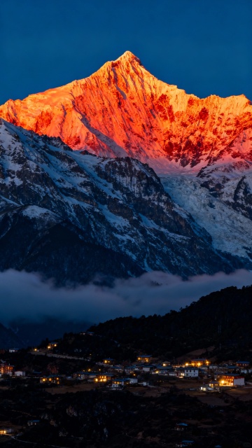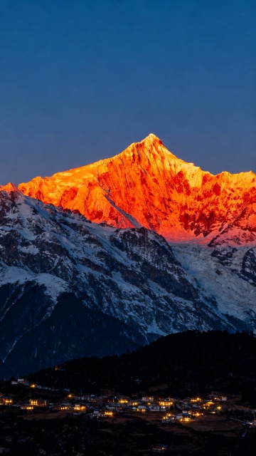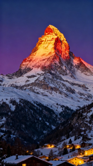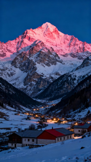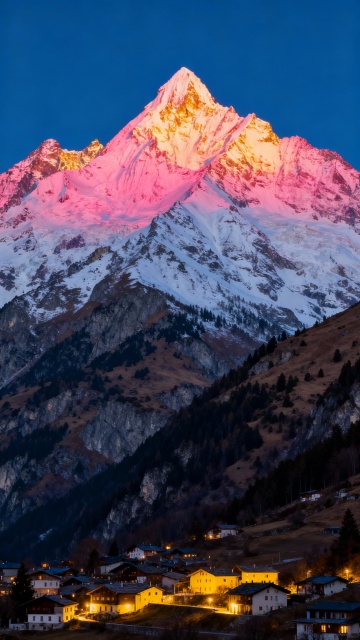 壮丽的雪山景观,山顶被日出的金色光芒照耀,呈现出温暖的橙红色渐变,山体覆盖着厚厚的积雪,岩石纹理清晰可见,山脚下是宁静的村庄,房屋灯火点点,周围环绕着低矮的山脉和茂密的森林,天空呈现出深邃的蓝色,整体画面光影对比强烈,色彩层次丰富,营造出神圣而宁静的氛围,从不同角度展现日照金山的雄伟与壮丽。
