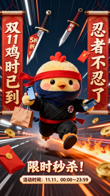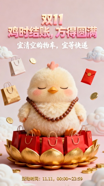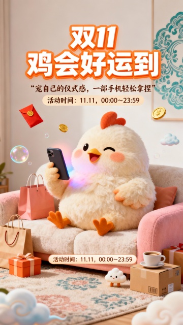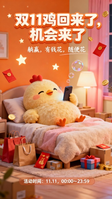 作品以温馨居家场景展现“双11夜购”氛围,小鸡在暖灯下抢购好物,象征幸福生活的甜蜜瞬间。前景的红包与金币强化节庆喜悦,画面温暖治愈。标题运用“鸡”与“机”的谐音趣味,巧妙融合幽默与节日热度,让观众在轻松愉快中感受购物的快乐与好运。