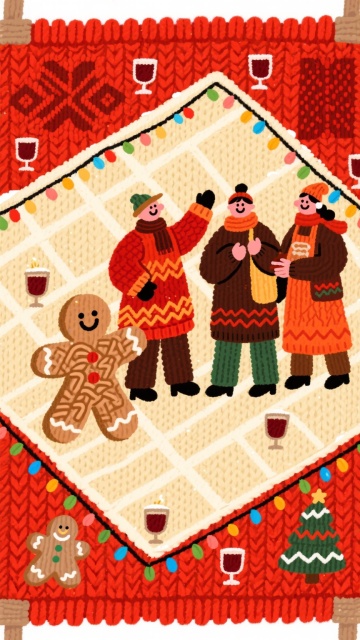 刺绣风插画,拟人化人物与姜饼人欢聚,红暖色调营造喜庆温馨圣诞氛围,点缀彩灯与酒杯,充满节日卡通感。