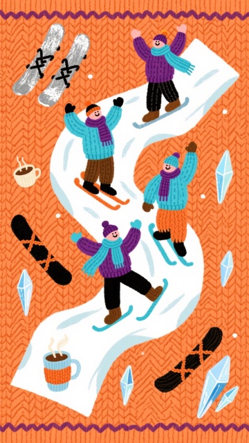 卡通感插画风,拟人化人物滑雪嬉戏,橙色针织纹理背景,搭配热饮与冰晶,温暖冬日氛围浓厚。