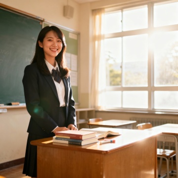 一位年轻貌美的女老师,面容姣好,皮肤白皙,眼睛明亮有神,笑容温柔亲切,长发披肩,穿着简约得体的教师服装,背景是明亮整洁的教室,阳光透过窗户洒进来,整体氛围温馨和谐