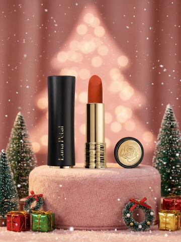 鎏金风3D质感唇膏,置于雕花礼盒中,搭配姜饼人点缀,融合奢华与喜庆,传递节日温馨与时尚可爱感。