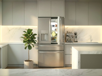 极简主义风格的白色双门冰箱位于画面中央,保持其原有形态与设计细节。冰箱周围环境改为温馨明亮的北欧风厨房一角,浅灰色木纹地板延伸至墙面,墙面采用柔和的米白色。冰箱右侧是原木色一字型橱柜,台面整洁,摆放着透明玻璃罐,内装杂粮与意面。橱柜上方悬挂着简约白色搁板,放置几只白色陶瓷碗碟。左侧靠近冰箱处有一盆大型龟背竹绿植,叶片舒展自然。画面左下角放置一把金色金属框架的餐椅,搭配浅灰色布艺坐垫。整体采用自然光线下的柔和光影,色调清新明快,营造出简约舒适的居家氛围,构图保持对称平衡,视觉焦点集中于冰箱主体,细节丰富且具有生活气息。