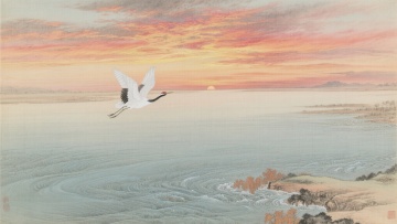 中国风背景,融合工笔与写意技法,淡彩水墨风格,以朱砂红与靛蓝为主色调,辅以鎏金点缀,远山如黛层叠起伏,近水含烟波光粼粼,空中仙鹤翩跹,水面浮萍点点,背景融入篆刻印章与祥云纹样,整体构图采用S形视觉引导线,营造古典雅致又不失灵动的意境