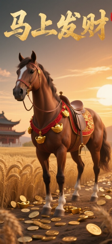 软3D风拟人小马,鎏金金属质感元宝与钱币环绕,喜庆红金配色,卡通感十足,传递新春暴富祝福。