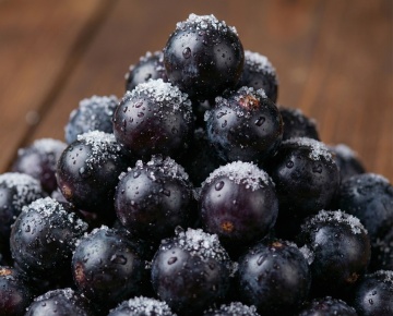 写实风格摄影,特写镜头,一串饱满紫黑色的葡萄,表面覆盖着晶莹剔透的水珠,水珠反射出光泽,葡萄梗翠绿,旁边搭配几片新鲜的深绿色葡萄叶,放置在浅棕色竹编托盘上,托盘边缘有竹条捆绑细节,背景为模糊的深色木质纹理,光线从斜上方柔和照射,形成明显的高光和阴影对比,营造出湿润、新鲜、自然的氛围,画面聚焦于葡萄的质感和水珠的细节,整体色调以紫色、绿色、棕色为主,色彩浓郁且和谐。