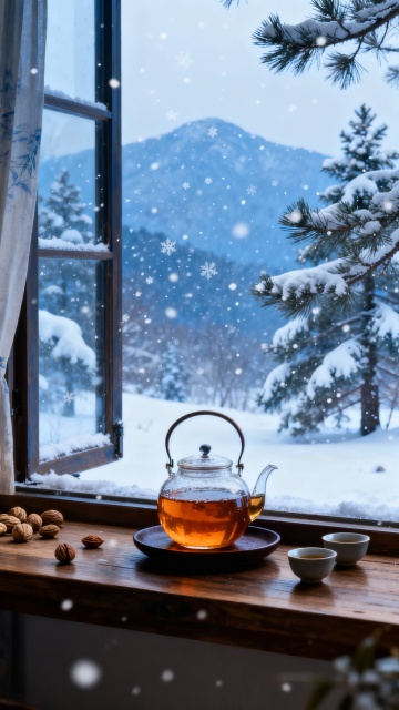日式庭院的青石小径铺雪,石灯笼亮着暖光,梅枝斜伸,花瓣沾雪。木廊下摆着暖炉,放着抹茶碗,雪落在灯笼纸罩上,浅棕 + 雪白配色,静谧禅意的冬日氛围。