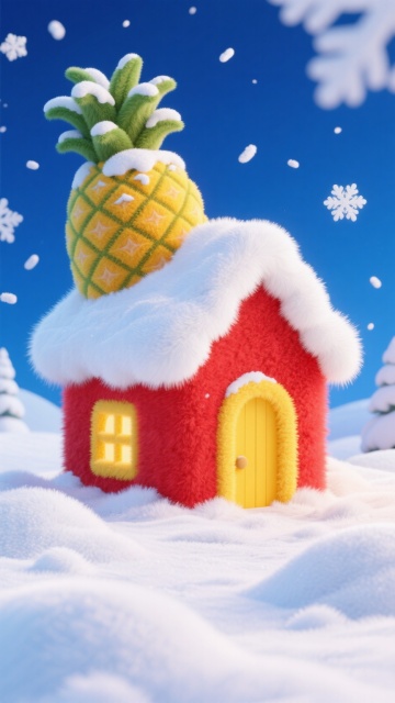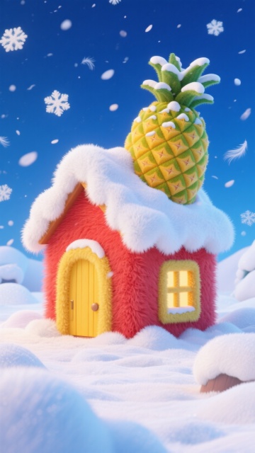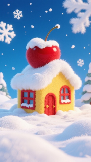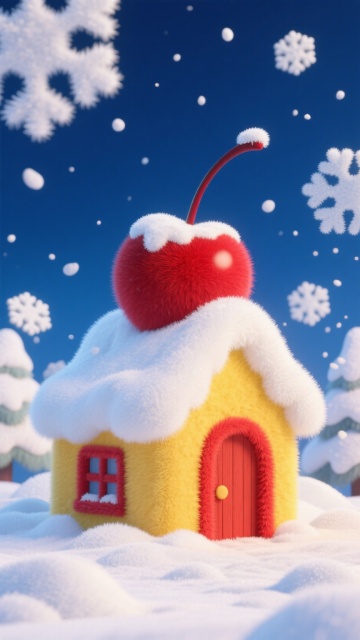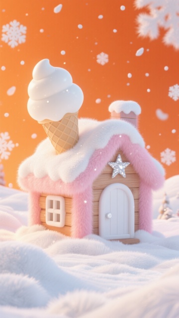 软3D风格的梦幻雪屋,粉嫩毛绒质感搭配冰淇淋烟囱,温馨可爱,营造冬日童话氛围。