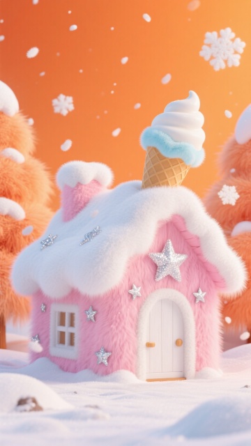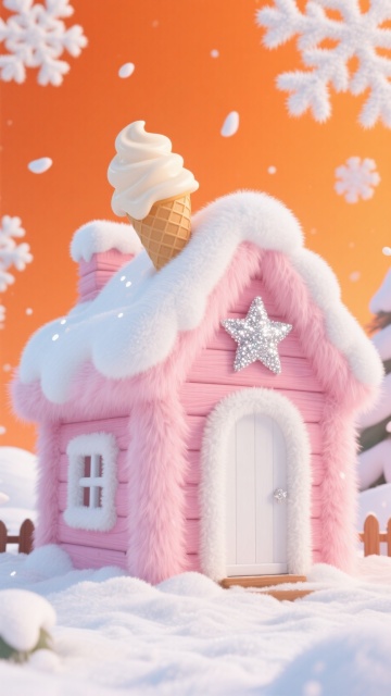 画面中心是粉色的小木屋(白色门和窗),上面有星星的装饰,屋顶覆盖白雪,房顶上有一个巨大的被雪覆盖的冰淇淋,橙色的天空,周边飘着白色雪花,地面有积雪