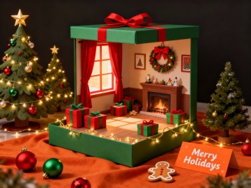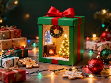 超写实风格圣诞场景,以红色和绿色为主色调,温暖柔和的侧光照明,前景是多个包装精美的圣诞礼物盒,包括红色带雪花图案、绿色带雪花图案、红色带金色条纹等款式,部分礼物盒上覆盖着少量蓬松的白雪,礼物盒周围点缀着松针和松果,背景是装饰有红色球形饰品和闪烁暖黄色串灯的圣诞树,树的枝叶上也有积雪,整体营造出温馨、喜庆、充满节日氛围的画面,不同画面的背景可替换为圣诞市场摊位、壁炉旁、挂满装饰的房间角落等具有圣诞元素的场景,保持相同的光影质感和色彩和谐度。
