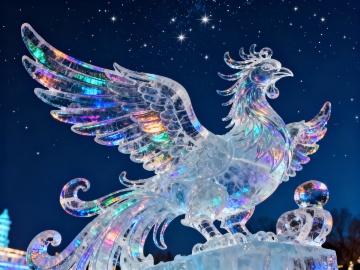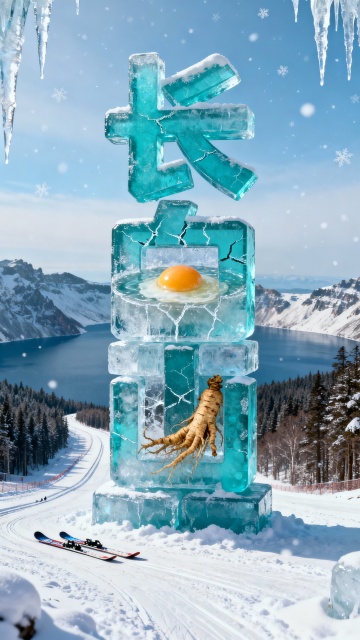 画面主视觉是由蓝色渐变冰晶堆叠而成的 “哈尔滨”艺术字。冰面覆雪,带有纹理细节,文字冰晶作为透明容器,内部冰封着冰棍、格瓦斯等哈尔滨特色食物。背景是哈尔滨中央大街欧式建筑群落,地面延伸出积雪铁轨、雪人。天空湛蓝,飘雪花,边缘点缀冰雕树枝。