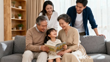 年老的母亲坐在沙发,旁边沙发上坐一个女人抱着她的肩膀,亲昵的姿势,一个男的站在沙发后面对镜头,在母亲和妻子后面中间弯腰搀扶着母亲和妻子,3岁的小女孩站在妻子和母亲中间