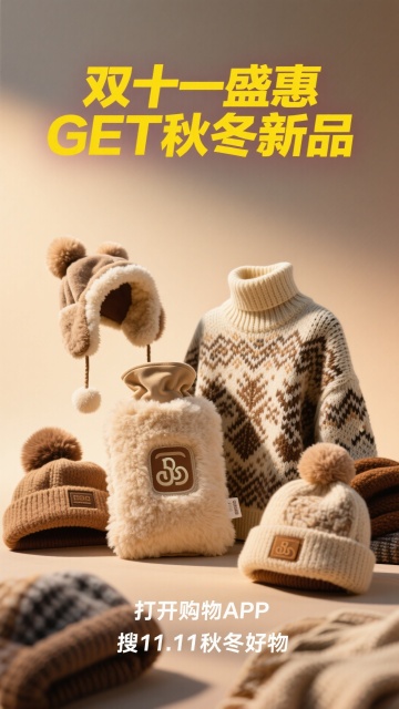 软3D风格的温馨冬日场景,毛绒质感的“11.11”数字与雪橇、围巾、糖果营造出可爱卡通氛围,暖色系搭配面料纹理,传递双11暖心购物季的节日温度。