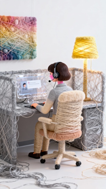 卡通感与3D风融合,毛发生长风营造柔软质感,拟人化办公场景呈现微缩艺术,虚拟现实中的温暖工作日常。