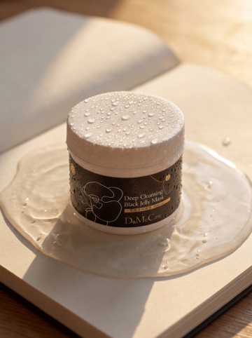 超写实电商产品图,被形态各异的透明水珠、水簇环绕,部分水珠附着产品表面。背景为低饱和渐变底色,冷调光源从侧下方照射,凸显产品科技感与成分专业性。材质表现哑光细腻,色彩搭配以主体色彩为主,色调柔和高级,构图采用轻微倾斜角度,动态元素环绕主体,含品牌 logo