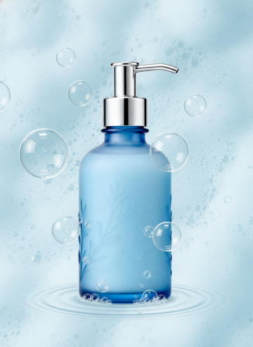 图中主体放到浅浅的水池中间,形成涟漪,周围有泡沫和泡泡,整体色调为浅蓝色