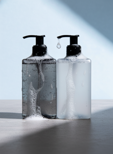 洗发水海报,两瓶浅蓝色透明液体洗发水瓶,带有白色按压泵头和白色标签,标签上有黑色文字“洗发水”和金色装饰,瓶身放置在石头上,石头下方有柔软的沙子,旁边点缀贝壳,整体采用清新的浅蓝色调,柔和的侧光照明,营造出自然、有机、纯净的氛围,背景蓝天白云,画面具有清晰的视觉层次,突出产品主体,光影效果细腻,水面有清晰的倒影,质感写实,设计简约自然