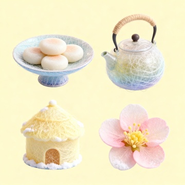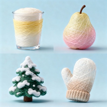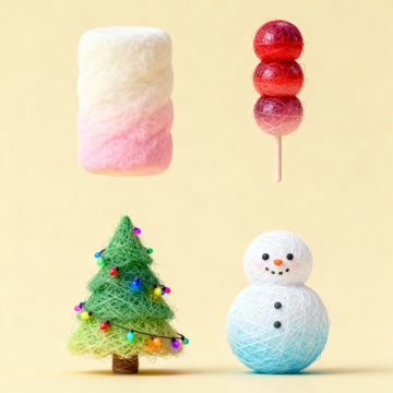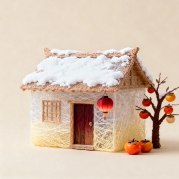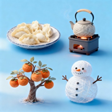 微缩艺术风融合毛发生长与粘土质感,轻拟物手法呈现温馨冬日场景:雪人、柿子树、茶壶与饺子,营造可爱梦幻的节日氛围。