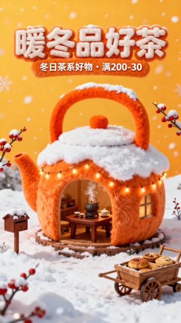 3D微缩艺术风,毛发生长质感茶壶屋,重拟物设计,暖冬氛围中透出梦幻与可爱,浮雕式文字搭配雪景,温馨感十足。