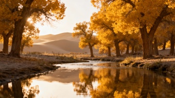 剪影风沙漠日落,驼队行于沙丘,枯树伫立,光影交织如油画,静谧中透出实景感。