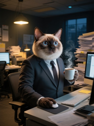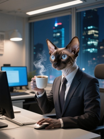 拟人胖乎乎圆滚滚布偶猫穿着西装左手拿着咖啡,右手握着鼠标,在办公室繁忙的加班,背景夜晚