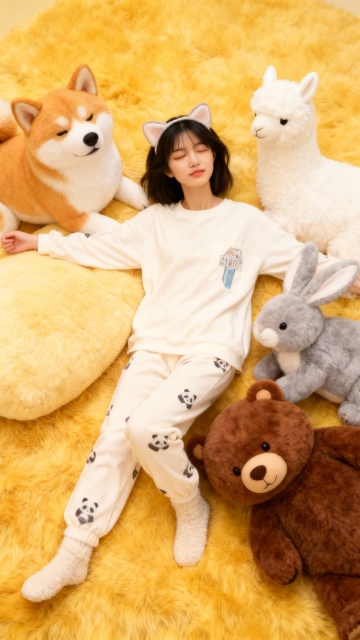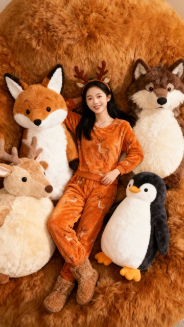 俯视视角,全景构图。画面主视觉是身着暖棕色带姜饼人图案冬装(厚外套、毛呢裙、雪地靴)、佩戴圣诞帽的人物,姿态欢快,笑坐在四只巨型毛绒动物围成的 “雪圈” 里(棕白驯鹿、米白北极熊、红棕松鼠、深棕麋鹿,均为圆润萌系造型,毛绒玩具质感蓬松细腻)。背景是大面积纯白雪地,点缀彩色雪球,毛绒动物与雪地纹理写实。
