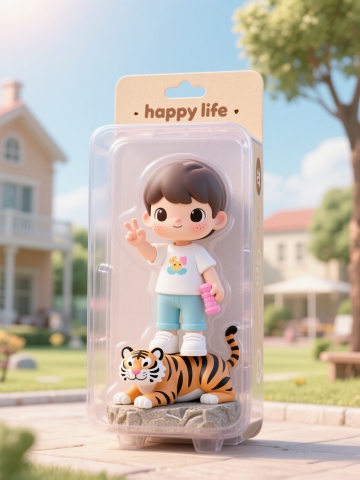 软3D风格卡通人偶,萌趣男孩与小虎相伴,塑料质感包装透出温馨可爱,节日氛围十足。