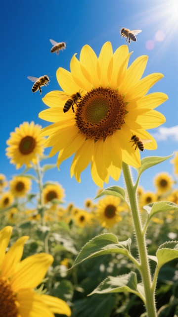一片向日葵花田,画面以写实风格呈现,主色调为明亮的黄色和深邃的蓝色,阳光明媚,光线从上方照射下来,形成清晰的光影效果,向日葵的花瓣质感细腻,花蕊呈棕色,充满生机与活力。
