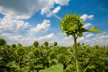 一片生机盎然的向日葵花田,前景中几朵盛开的向日葵占据主要视觉位置,金黄色的花瓣层层叠叠,中心是深棕色的花盘,布满细密的葵花籽,花茎挺拔,翠绿的叶片舒展,边缘带有自然的锯齿。向日葵们迎着阳光,花盘微微上扬。背景是晴朗的蓝天,漂浮着几朵蓬松的白云,阳光明媚,光线充足,在花瓣和叶片上形成明亮的高光和清晰的阴影,整体画面色彩鲜艳明快,充满夏日的活力与温暖。
