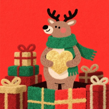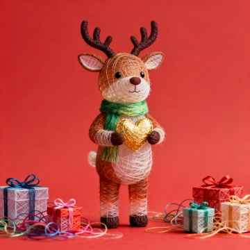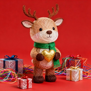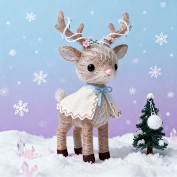 毛线编织的萌鹿,软3D质感搭配微缩艺术场景,梦幻雪景中点缀水晶与小树,充满可爱、温馨的节日氛围。