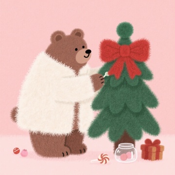 插画风圣诞场景,扁平化设计融合毛发生长质感,拟人化圣诞老人与笑脸星星树顶,搭配礼物与雪景,传递喜庆卡通氛围。
