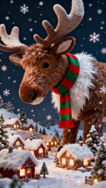 3D微缩艺术风圣诞场景,拟物化驯鹿戴红绿围巾,毛发生长细节逼真,粒子雪花飘落,暖光小屋营造温馨梦幻感,喜庆节日氛围浓厚。