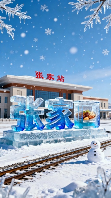 画面主视觉是由蓝色渐变冰晶堆叠而成的 “张家口”艺术字。冰面覆雪,带有纹理细节,文字冰晶作为透明容器,内部冰封着张家口特色食物。背景是张家口展览馆,地面延伸出积雪铁轨、雪人。天空湛蓝,飘雪花,边缘点缀冰雕树枝。