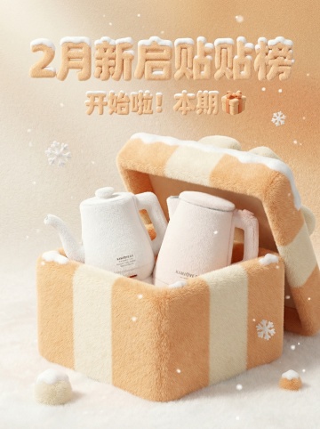 主体为橙色茶壶造型小屋(屋顶积雪、橙色提手,内部设棕色茶桌、冒着热气的茶炉、茶具,外围环绕暖橙串灯);场景是飘雪的雪地,分布带雪红梅、棕色木信箱、载满点心的木推车;上方 3D 橙色毛绒字体设计的主副标题组合 “暖冬品好茶”+“冬日茶系好物・满 200-30”,橙黄色背景。