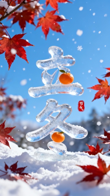 清透冰雕“立冬”大字,融中式意境与重拟物风,橙果点缀,雪中枫叶环绕,梦幻实景感十足,节气主题跃然眼前。