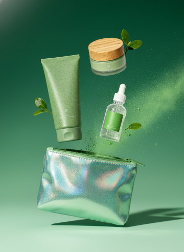 清新绿意跃动,3D风与软3D质感交织,金属光泽收纳包悬浮释放自然元素,粒子飘散营造虚实交融的未来感,传递舒适、科技与时尚共生的护肤新体验。