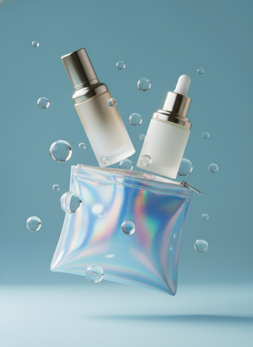 未来感与科技感交织,清透玻璃风瓶身搭配液态光效包袋,轻拟物3D设计,水珠悬浮营造柔和梦幻氛围,展现纯净护肤美学。