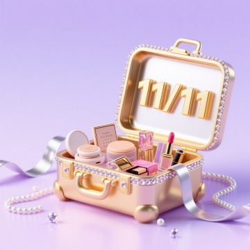 3D重拟物风格,柔和粉调营造甜美舒适感,金属质感唇膏与塑料风礼盒交织,节日氛围浪漫精致。