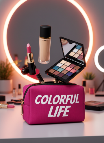 3D风格美妆场景,重拟物设计融合霓虹光影,塑料质感突出,时尚潮流中透出梦幻氛围,展现色彩生活的节日美学。