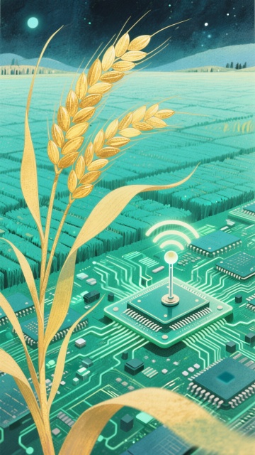 插画风未来感设计,麦穗与电路板融合,展现虚拟自然与科技的超现实主义碰撞。