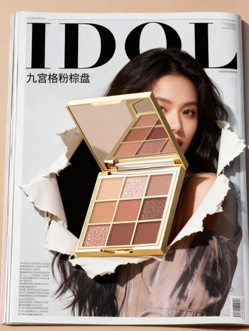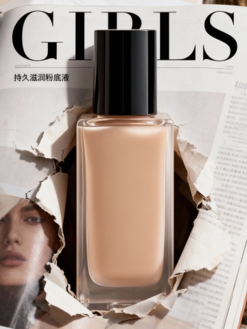 杂志风封面撕裂,露出粉底液瓶身,时尚感与拼贴艺术结合,现代简约美学,传递轻盈滋润的护肤体验。