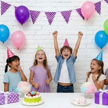 喜庆感十足的儿童生日派对,卡通风格与实景结合,轻拟物风装饰搭配拼贴元素,梦幻清新,充满欢乐氛围。