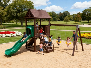 写实风格的3D场景,重拟物风设计展现儿童乐园实景感,阳光洒落下的光影感营造清新舒适氛围,充满温馨与趣味,现代感十足。