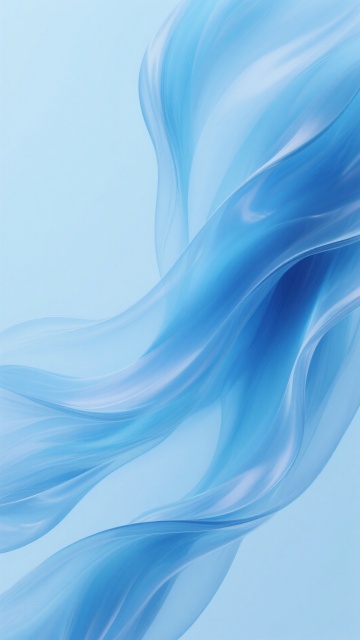 深邃的蓝色渐变背景,具有流动感的波浪纹理,从画面左侧向右下方倾斜延伸,形成动态的视觉引导线,光影效果柔和,高光部分集中在波浪的顶部边缘,呈现出透明的玻璃质感,整体构图呈现出不对称的平衡美感,色彩从深蓝到浅蓝自然过渡,营造出宁静而富有张力的氛围。