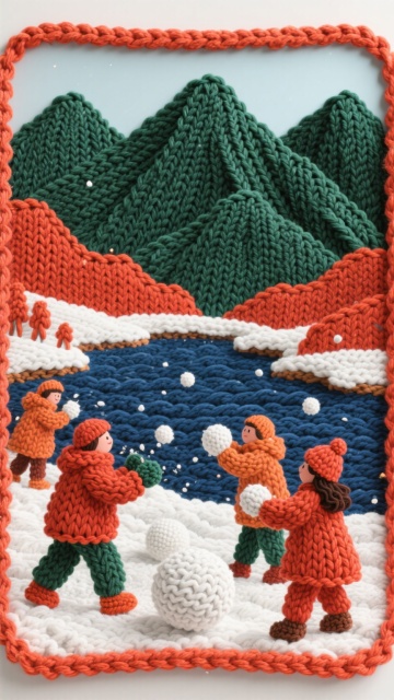 毛线编织的冬日露营场景,拟人化小人围坐篝火烤棉花糖,温暖治愈。微缩艺术风搭配卡通感设计,展现温馨可爱的节日氛围。