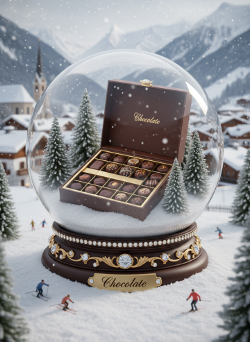 写实风格。主视觉是精美零食礼盒(含曲奇 + 巧克力,有蝴蝶结装饰),竖立放在商场圣诞橱柜内。背景是挂彩灯的迷你圣诞树,飘雪花,前景有微型糖果摆件围礼盒。