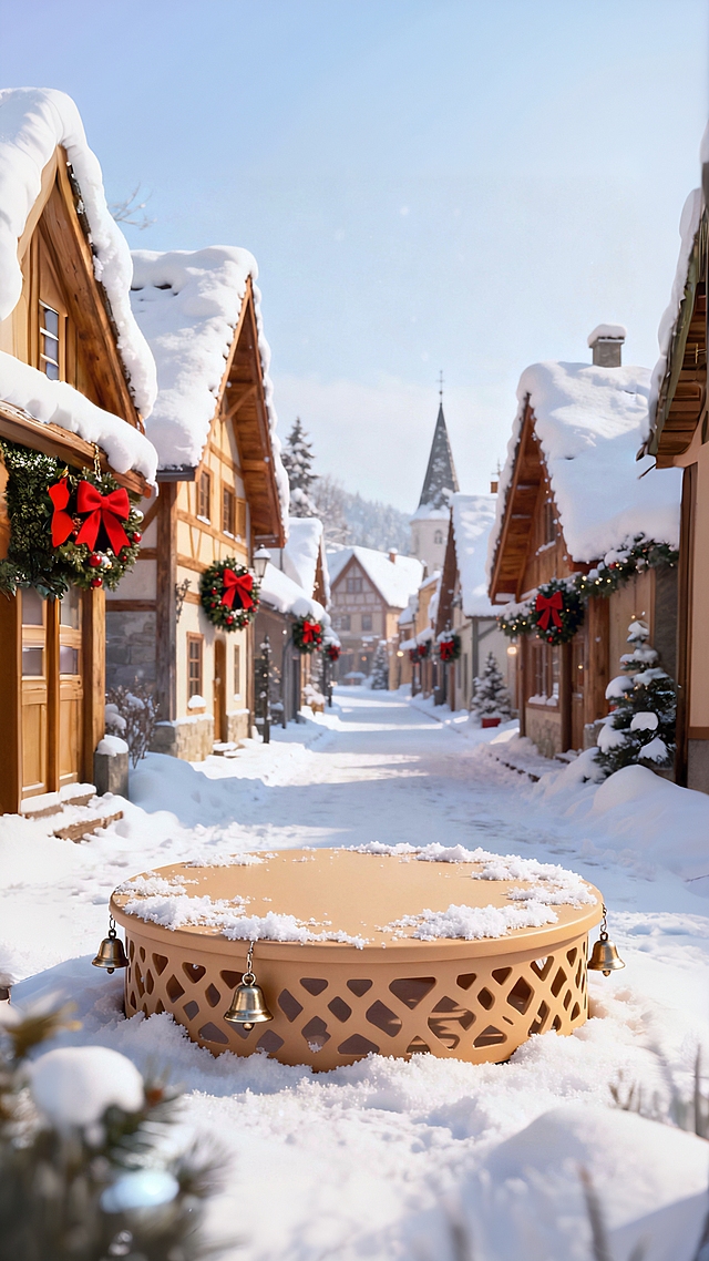3D 虚拟自然环境,主体是浅棕圆形展台,镂空设计覆薄雪,边缘挂小铃铛。背景是北欧雪镇,尖顶木屋覆雪,街道铺雪,点缀圣诞花环,暖黄 + 雪白配色,明亮温馨。详情