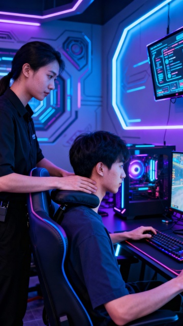 赛博朋克风科技感场景,霓虹灯与金属质感交织,潮流青年手持未来感耳机,展现数字时代先锋美学。